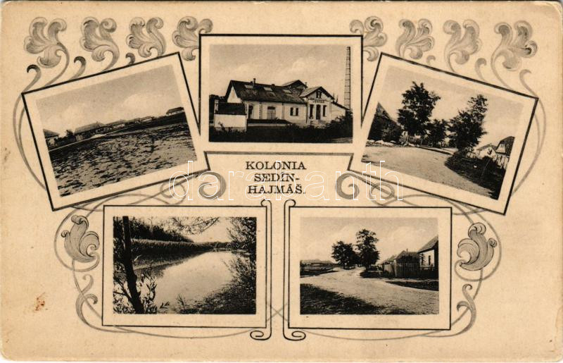 1938 Szőgyén-Hajmás, Kolonia Sedín-Hajmás, Svehlovo, Nové Osady (Nagyfödémes, Velké Úlany); Iskola, Szeszgyár, lepárló, utcakép, Kis-Duna, lakások / school, distillery, street view, Maly Dunaj, apartment blocks. Art Nouveau (Rb)