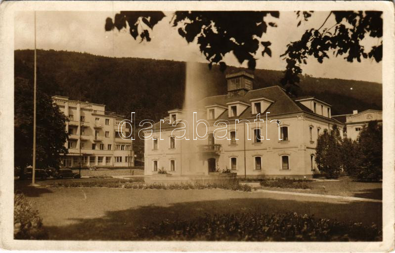 Leírás: 1951 Trencsénteplic, Trencianske Teplice; Tri Srdcia a Luxor / fürdő, szökőkút, Luxor szálloda, automobilok / spa, bathhouse, fountain, hotel, automobiles (EB)
