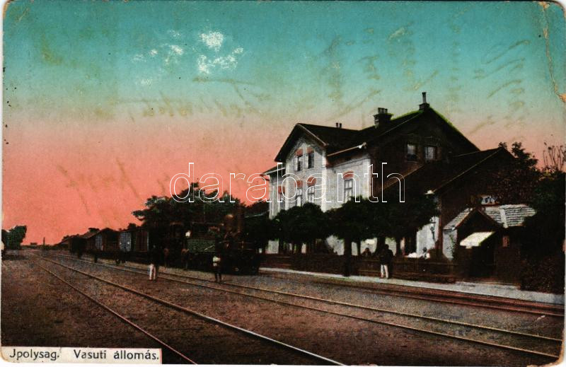 Leírás: Ipolyság, Sahy; vasútállomás, vonat, gőzmozdony / railway station, locomotive, train + "IPOLYSÁG" (EB)