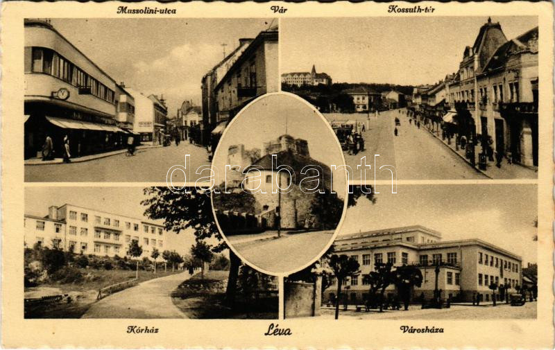 Leírás: Léva, Levice; Mussolini utca, Kossuth tér, vár, kórház, Városháza / street, square, castle, hospital, town hall