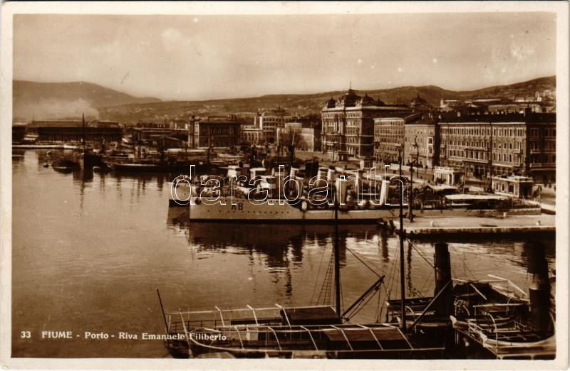 1938 Fiume, Rijeka; Porto, Riva Emanuele Filiberto / kikötő, gőzhajók ... https://www.darabanth.com/hu/518-Filatelia-kepeslap-numizmatika-mutargy-konyv-papirregiseg-ekszer-aukcio/524.0/Kepeslapok/Horvatorszag~745/1938-Fiume-Rijeka-Porto-Riva-Emanuele-Filiberto-kikoto-gozhajok-port-steamships~II3519966
