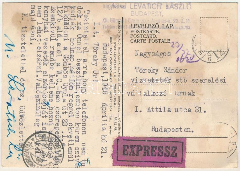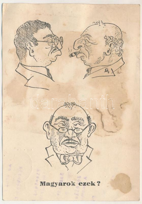 1940 Magyarok ezek? Gúnyos antiszemita propaganda lap. Felelős kiadó nagykálnai Levatich László, Held János könyvnyomdája. A levél feladója maga a kiadó, nagykálnai Levatich László magánzó, bérházjövedelemből tartotta fenn magát. Antiszemita és antibolsevista nyomtatványait elsősorban a Held nyomdában adta ki. / Anti-Semitic propaganda card, Judaica mocking art postcard. Letter of the Antisemitic publisher (fl)
