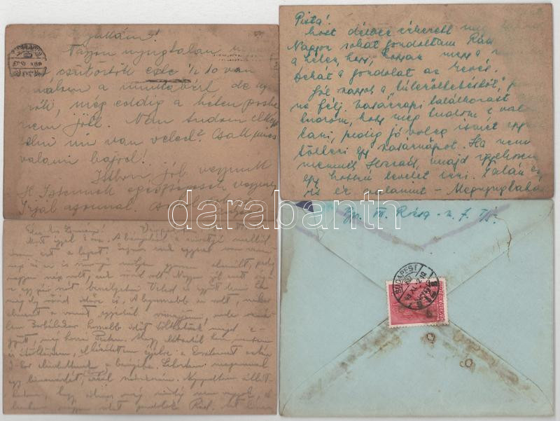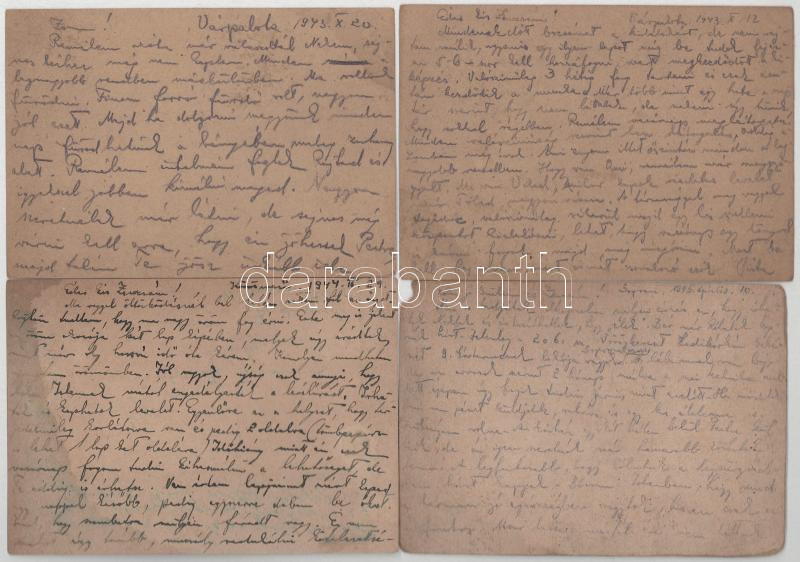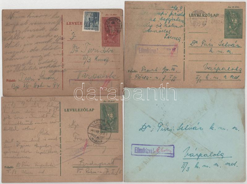 56 db magyar második világháborús zsidó KMSZ (közérdekű munkaszolgálatos) tábori posta II/3. munkás század, Dr. Túri István (a Kristály gőzmosó cégtulajdonosa, VII. Dob utca 94.) és családja (későbbi felesége: Frank Zsuzsanna 1924-2014, fizikus, a Fizikai Szemle szerkesztője) között főleg 1943-1944-ből, több különböző helyszínről + 4 db levél. Judaika. Érdekes családtörténeti anyag!! / 56 WWII Hungarian letters between a Jewish labor serviceman and his family, mainly from 1943-1944 from different places + 4 letters. Judaica