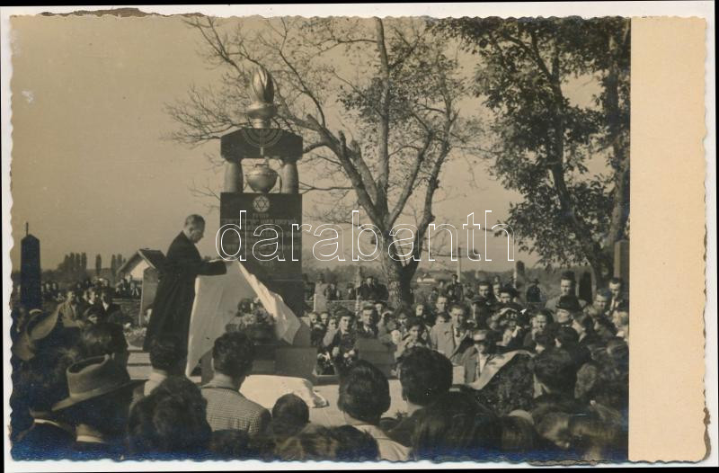 Leírás: Palánka, Bácspalánka, Backa Palanka; Holokauszt emlékmű avatása a zsidó temetőben 1955-ben. Judaika / unveiling ceremony of the Holocaust memorial in the Jewish cemetery in 1955. Judaica. photo (non PC) (ragasztónyom / glue marks)