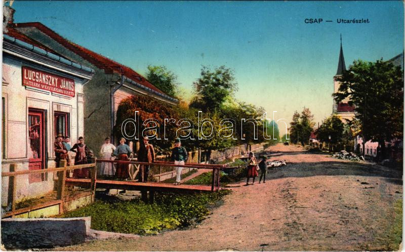 Leírás: 1915 Csap, Chop, Cop; utcakép, Lucsánszky János üzlete. Vasúti levelezőlapárusítás 8537. / street view with shop (kis szakadás / small tear)