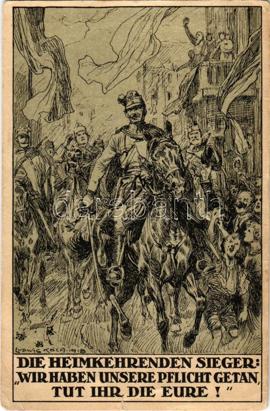 Leírás: 1918 Die heimkehrenden Sieger: "Wir haben unsere Pflicht getan, tut Ihr die Eure!" / WWI Austro-Hungarian K.u.K. military art postcard s: Ludwig Koch + "Tábori postahivatal 433" (szakadás / tear)