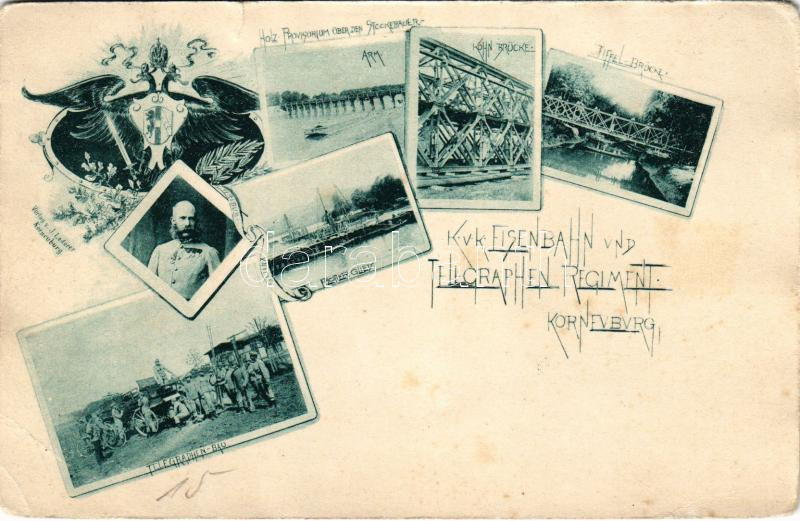 Korneuburg, K.u.K. Eisenbahn und Telegraphen Regiment,Telegraphen Bau, Pilotier Glied, Holz -Provisorium Über den Stockerauerarm, Kohn Brücke, Tiffel Brücke. Viribus unitis. Verlag v. J. Lederer / Cs. és kir. vasúti és távirati ezred szecessziós katonai képeslap / Austro-Hungarian military railway and telegraph regiment. Art Nouveau, floral (kis szakadás / small tear)
