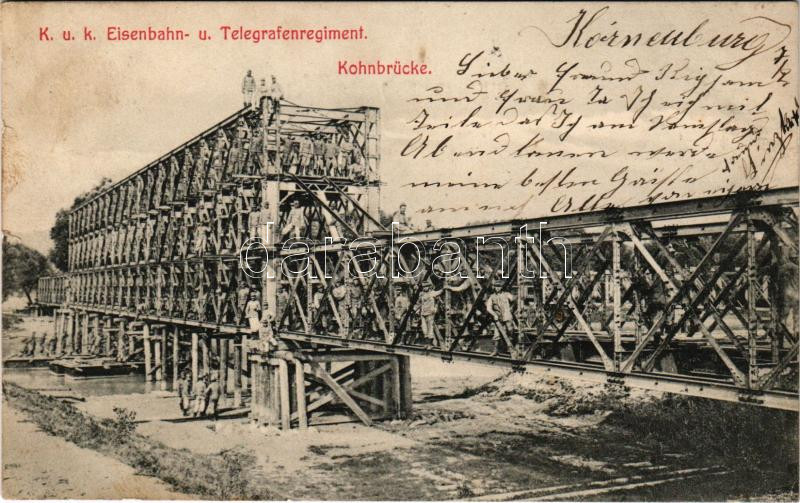 K.u.K. Eisenbahnregiment. Kohnbrücke / Cs. és kir. vasúti ezred hídépí... https://www.darabanth.com/hu/518-Filatelia-kepeslap-numizmatika-mutargy-konyv-papirregiseg-ekszer-aukcio/524.0/Kepeslapok/Katonai~814/KuK-Eisenbahnregiment-Kohnbrucke-Cs-es-kir-vasuti-ezred-hidepites-kozben-~II3516655