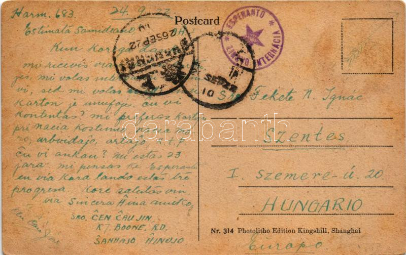 1922 Shanghai, The Willow Pattern Tea House in the Native City, Espera... https://www.darabanth.com/hu/518-Filatelia-kepeslap-numizmatika-mutargy-konyv-papirregiseg-ekszer-aukcio/524.0/Kepeslapok/Kina~770/1922-Shanghai-The-Willow-Pattern-Tea-House-in-the-Native-City-Esperanto-letter-TCV-card-tear~II3518581