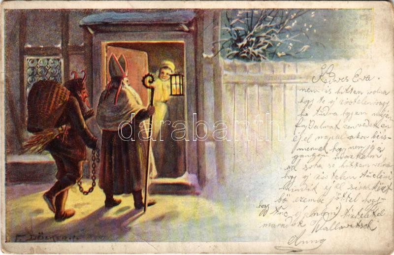 Krampusz és Mikulás / Krampus and Saint Nicholas s: Döcker (fl) https://www.darabanth.com/hu/518-Filatelia-kepeslap-numizmatika-mutargy-konyv-papirregiseg-ekszer-aukcio/524.0/Kepeslapok/Krampusz~816/Krampusz-es-Mikulas-Krampus-and-Saint-Nicholas-s-Docker-fl~II3521733