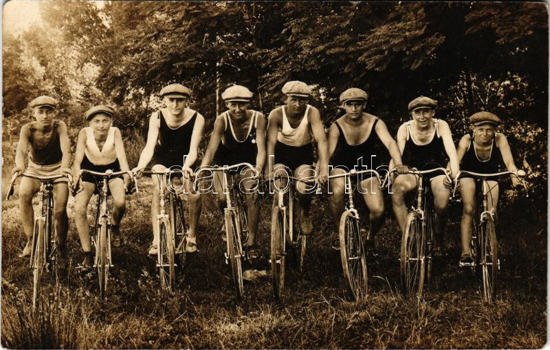 1926 Siófok, kerékpáros férfiak. photo https://www.darabanth.com/hu/518-Filatelia-kepeslap-numizmatika-mutargy-konyv-papirregiseg-ekszer-aukcio/524.0/Kepeslapok/Magyarorszag~742/1926-Siofok-kerekparos-ferfiak-photo~II3517464