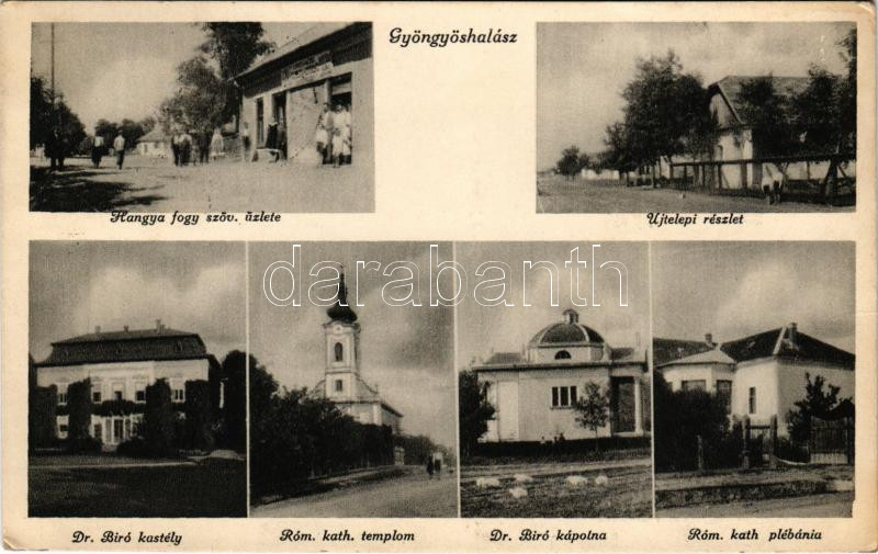 Leírás: 1933 Gyöngyöshalász, Gyöngyös-Halász; Hangya üzlete, Újtelepi részlet, Dr Bíró kastély és kápolna, római katolikus templom és plébánia. Hangya kiadása