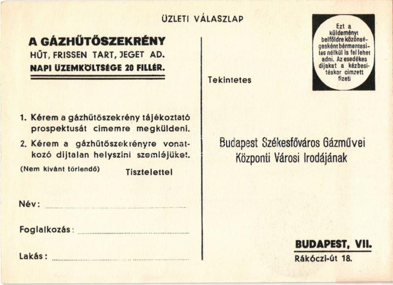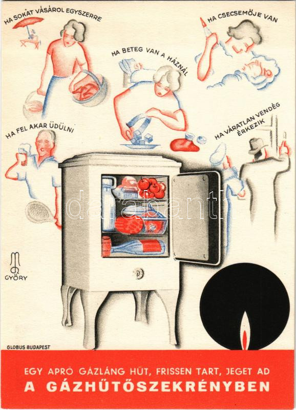 Leírás: Egy apró gázláng hűt, frissen tart, jeget ad! Gázhűtőszekrény. Székesfővárosi Gázmúvek Art Deco reklámlapja. Globus nyomda / Hungarian gas refrigerator Art Deco advertising postcard s: Győry