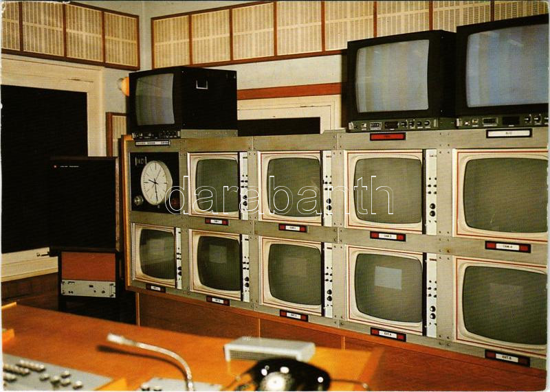 Leírás: Magyar Televízió (MTV) kamera irányító szoba, kamerák figyelése TV készülékeken keresztül. "Kereskedelmi forgalomba nem hozható" modern lap (EK)