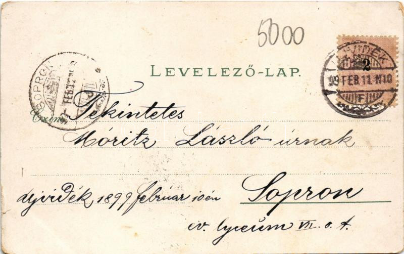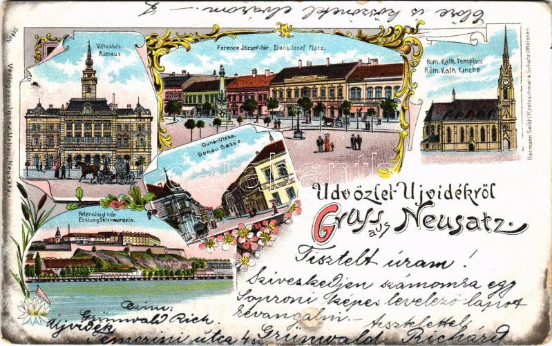 1899 Újvidék, Neusatz, Novi Sad; Városháza, Ferenc József tér, Római katolikus templom, Péterváradi vár, Duna utca, üzletek. Ignaz Urban kiadása / Rathaus, Franz Josef Platz, Röm.-Kath. Kirche, Donau Gasse, Festung Peterwardein / town hall, square, street view, Catholic church, Petrovaradin castle. Hermann Seibt No. 905. Art Nouveau, floral, litho (kis szakadás / small tear)