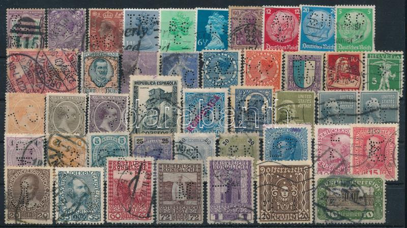 Leírás: 44 db vegyes külföldi céglyukasztásos bélyeg, stecklapon