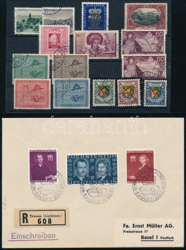 Leírás: Liechtenstein kis tétel jobbakkal, közte 15 db bélyeg, 1 levél és egy kivágás blokkal