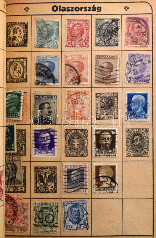 Leírás: Sok száz régi, főleg külföldi bélyeg kopott Tolnai bélyegalbumban + iskolai füzetben