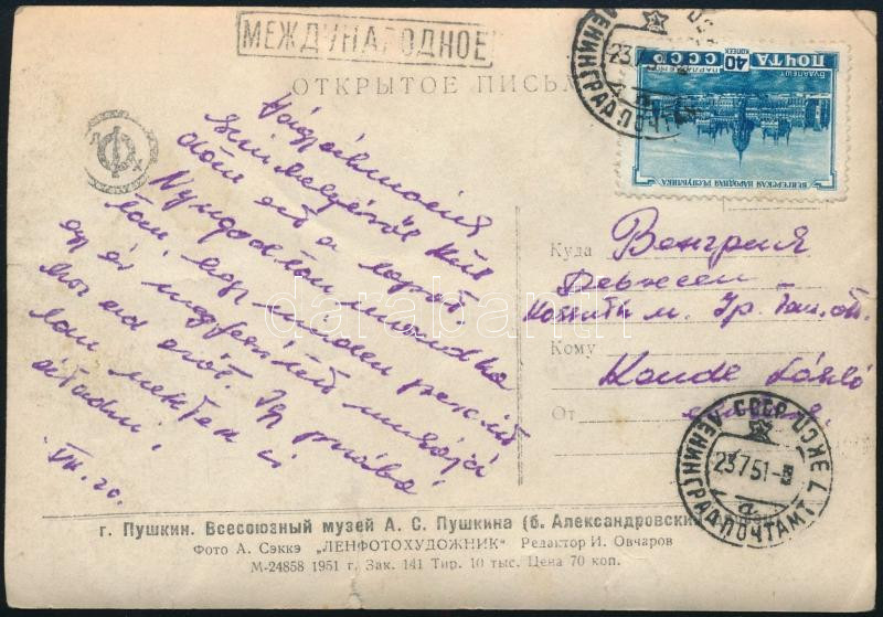 Szovjetunió 1951 (szakadás / tear) https://www.darabanth.com/hu/518-Filatelia-kepeslap-numizmatika-mutargy-konyv-papirregiseg-ekszer-aukcio/524.0/Kiemelt-kulfoldi-filatelia-tetelek-es-gyujtemenyek/Kulfoldi-levelek-alacsony-kikialtasi-aron~11/Szovjetunio-1951-szakadas-tear~II3521560