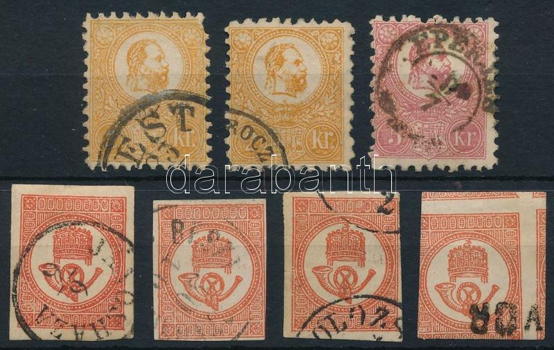 Leírás: 1871 Kőnyomat tétel stecklapon: 2 x 2kr, 5kr és 4 x Hírlapbélyeg (min 133.000) (2kr hiányzó fog / missing perf, 5kr papírelvékonyodás / thin paper)