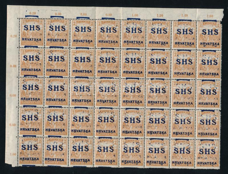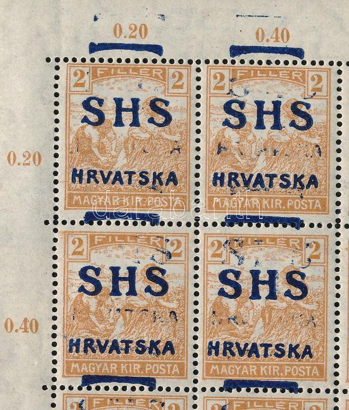 Leírás: SHS 1918 Arató 2f 40-es ívdarab, a legtöbb bélyegen látványos kettős felülnyomás! Bodor vizsgálójellel (200.000)