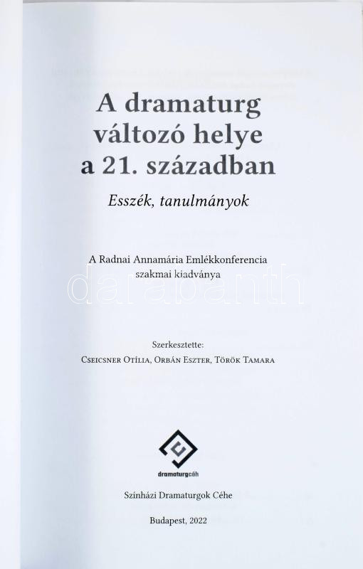 Leírás: A dramaturg változó helye a 21. században. Esszék, tanulmányok. A Radnai Annamária Emlékkonferencia szakmai kiadványa. Szerk.: Cseicsner Otília, Orbán Eszter, Török Tamara. Bp., 2022, Színházi Dramaturgok Céhe, 177 p. Kiadói papírkötés.