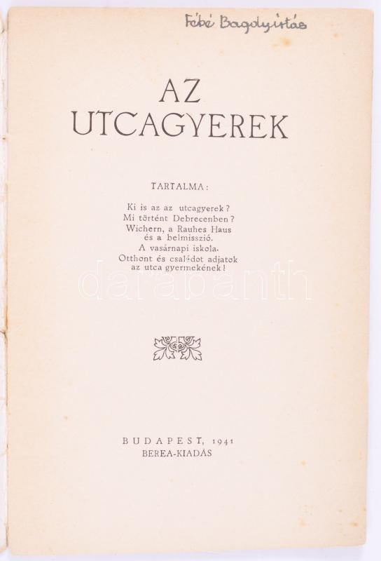 Az utcagyerek. Bp., 1941, Berea-ny.,31+1 p. Kiadói illusztrált papírkö... https://www.darabanth.com/hu/518-Filatelia-kepeslap-numizmatika-mutargy-konyv-papirregiseg-ekszer-aukcio/524.0/Konyvek/Konyvek-Egyeb-ritkasagok~136/Az-utcagyerek-Bp-1941-Berea-ny-31plus1-p-Kiadoi-illusztralt-papirkotes-kisse-kopott-kisse~II3503207