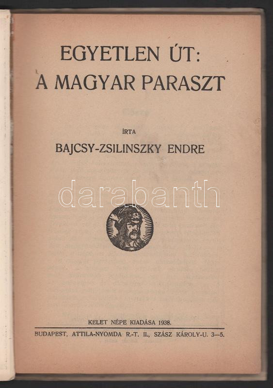 Bajcsy-Zsilinszky Endre: Egyetlen út: A magyar paraszt. Bp., 1938, Kel... https://www.darabanth.com/hu/518-Filatelia-kepeslap-numizmatika-mutargy-konyv-papirregiseg-ekszer-aukcio/524.0/Konyvek/Konyvek-Egyeb-ritkasagok~136/Bajcsy-Zsilinszky-Endre-Egyetlen-ut-A-magyar-paraszt-Bp-1938-Kelet-Nepe-Attila-Nyomda~II3494848