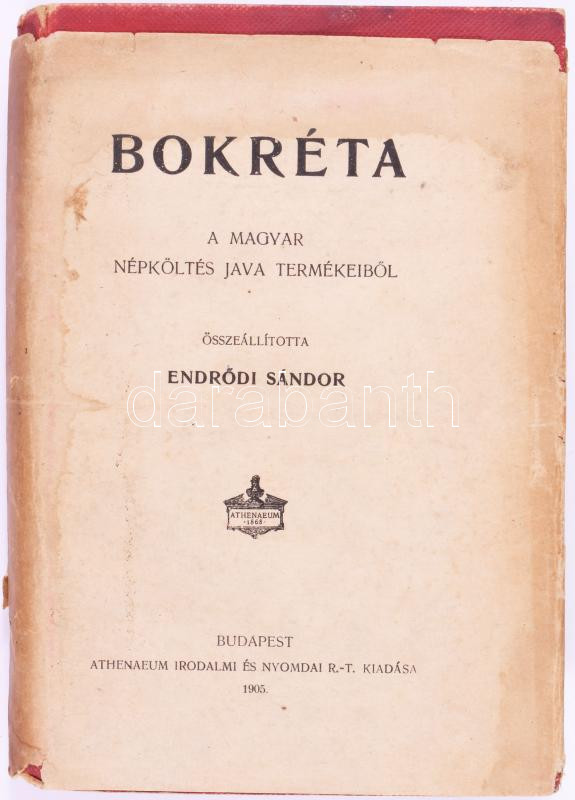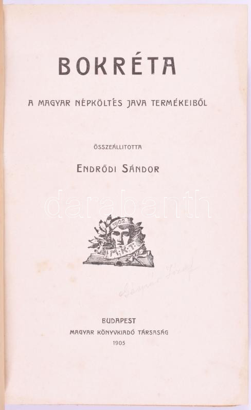 Bokréta. A magyar népköltés java termékeiből. Összeáll.: Endrődi Sándo... https://www.darabanth.com/hu/518-Filatelia-kepeslap-numizmatika-mutargy-konyv-papirregiseg-ekszer-aukcio/524.0/Konyvek/Konyvek-Egyeb-ritkasagok~136/Bokreta-A-magyar-nepkoltes-java-termekeibol-Osszeall-Endrodi-Sandor-Bp-1905-Magyar~II3521060