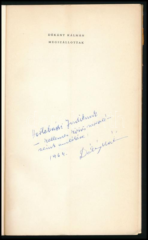 Dékány Kálmán: Megszállottak. DEDIKÁLT! Bp., 1961, Magvető. Kiadói pap... https://www.darabanth.com/hu/518-Filatelia-kepeslap-numizmatika-mutargy-konyv-papirregiseg-ekszer-aukcio/524.0/Konyvek/Konyvek-Egyeb-ritkasagok~136/Dekany-Kalman-Megszallottak-DEDIKALT-Bp-1961-Magveto-Kiadoi-papirkotes-kopott-boritoval~II3495027