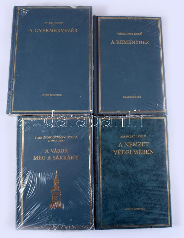 Leírás: Gilde könyvek sorozat 4 kötete: Bárdossy László: A nemzet védelmében.; Gilde József: A gyermekvezér.; vitéz Somogyváry Gyula (Gyula diák): A város meg a sárkány.; Várkonyi Ernő: A reményhez. Kiadói műbőr-kötés, bontatlan zsugorfóliában.