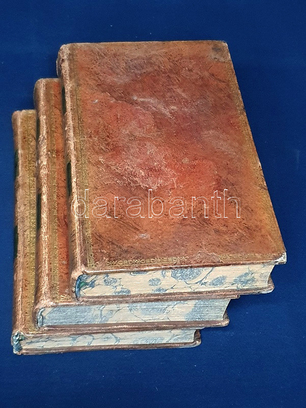 Egységes, aranyozott korabeli bőrkötésben, márványmintás festésű lapszélekkel, a kötéstáblákon aranyozott, ornamentikus keretdísszel. Jó példány.