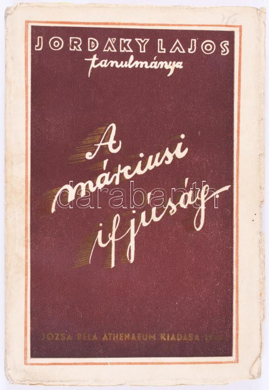 Leírás: Jordáky Lajos: A márciusi ifjúság. Tanulmány. DEDIKÁLT! Kolozsvár, 1945, Józsa Béla Athenaeum, 164 p. Kiadói illusztrált papírkötés, kissé szakadozott borítóval.