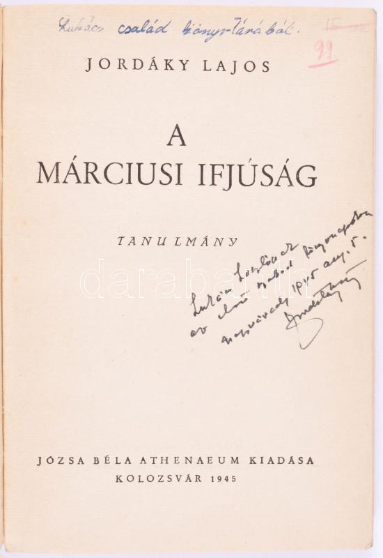 Jordáky Lajos: A márciusi ifjúság. Tanulmány. DEDIKÁLT! Kolozsvár, 194... https://www.darabanth.com/hu/518-Filatelia-kepeslap-numizmatika-mutargy-konyv-papirregiseg-ekszer-aukcio/524.0/Konyvek/Konyvek-Egyeb-ritkasagok~136/Jordaky-Lajos-A-marciusi-ifjusag-Tanulmany-DEDIKALT-Kolozsvar-1945-Jozsa-Bela-Athenaeum-164~II3503530