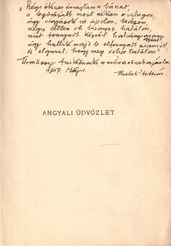 Az első levélen verses dedikáció: "Régi ékszer énrajtam a bánat, / a legdrágább most nékem e világon, / úgy vigyázok rá, ápolom, becézem, / mégis féltem, oh, bizonyos halálom, / mint fonnyadt kézről halvány arany gyűrű, / úgy hullik majd le elfonnyadt szívemről, / és elgurul, hogy meg sohse találom. -- Ürmössy Anikónak, a művésznőnek ajánlom: Keleti Arthur. 1917. május".