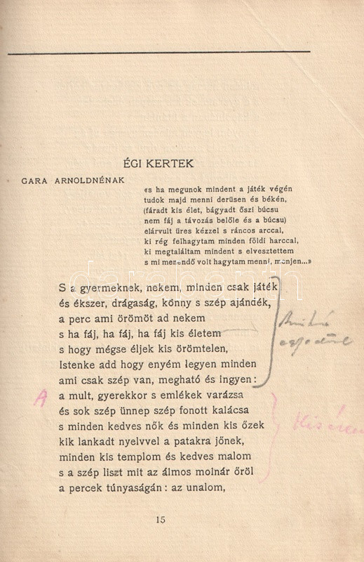 Dedikációjához Keleti Arthur a fenti, saját, publikálatlan, "Elhagyott leány panasza" címen ismert költeményét használta fel. Néhány oldalon saját kezű korrektúrajelek, illetve szcenírozási jegyzetek: a kötet egy versét a költő közösen adta elő Ürmössy Anikó színésznővel. Kötetünk könyvdíszét és borítórajzát Gara Arnold grafikusművész rajzolta. Példányunkból a címlap hiányzik.