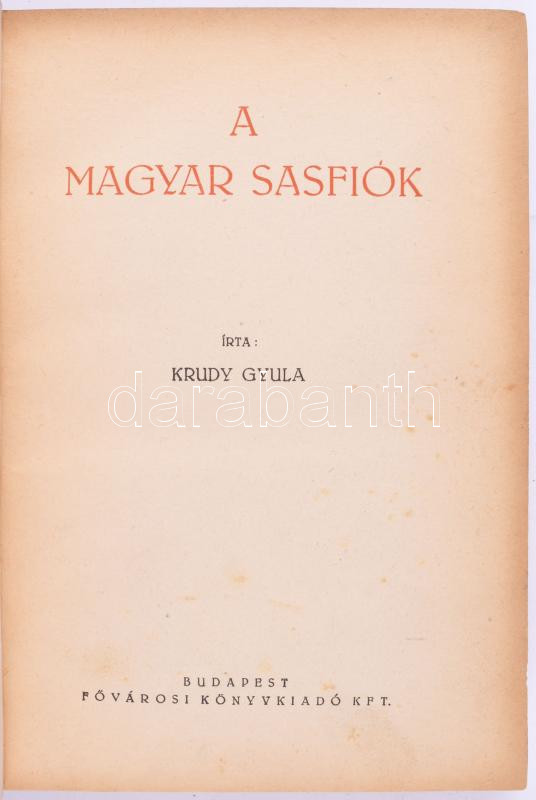 Krudy Gyula: A magyar sasfiók. Bp.,[1944.],Fővárosi Könyvkiadó Kft. 1 ... https://www.darabanth.com/hu/518-Filatelia-kepeslap-numizmatika-mutargy-konyv-papirregiseg-ekszer-aukcio/524.0/Konyvek/Konyvek-Egyeb-ritkasagok~136/Krudy-Gyula-A-magyar-sasfiok-Bp-1944-Fovarosi-Konyvkiado-Kft-1-t-plus-187plus5-pplus10-t-Kiadoi~II3503239
