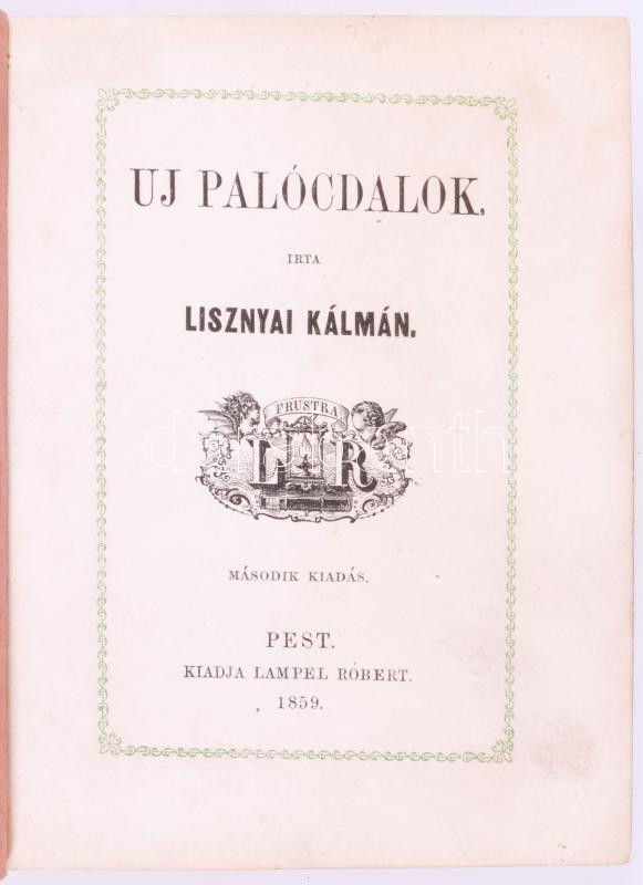 Lisznyai Kálmán: Uj palócdalok. Pest, 1859, Lampel Róbert, XV+[1]+292 ... https://www.darabanth.com/hu/518-Filatelia-kepeslap-numizmatika-mutargy-konyv-papirregiseg-ekszer-aukcio/524.0/Konyvek/Konyvek-Egyeb-ritkasagok~136/Lisznyai-Kalman-Uj-palocdalok-Pest-1859-Lampel-Robert-XVplus1plus292-p-Masodik-kiadas-Atkotott~II3521043