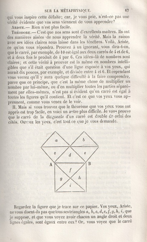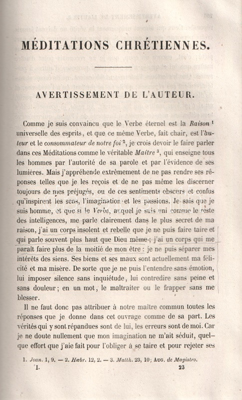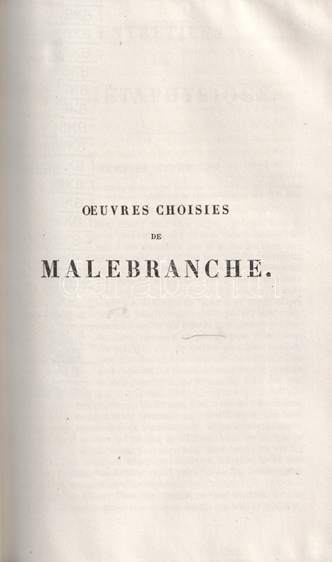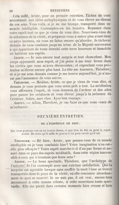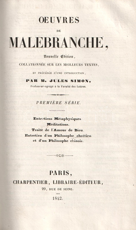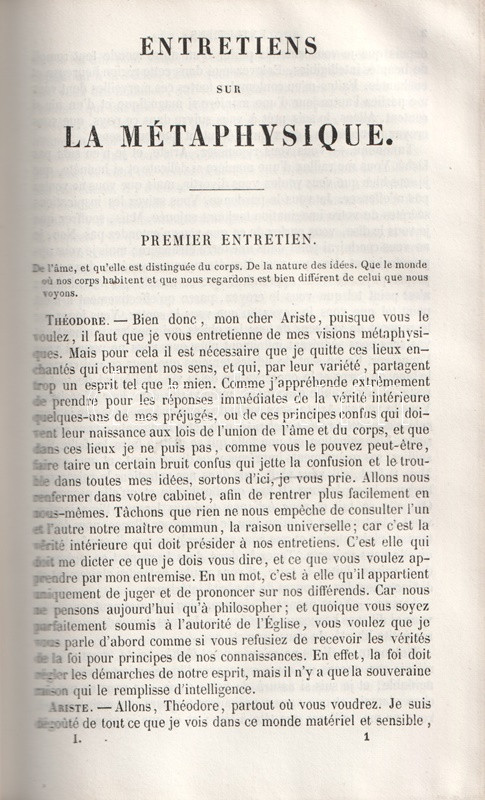 A párizsi Charpentier kiadó Nicolas Malebranche (1638-1715) francia teológus, filozófus, esszéíró munkásságának kiadását kötetünkkel kezdte meg. A gyűjteményben a szerző filozófiai dialógusai és vallási meditációi. A sorozat második része 1850-ben jelent meg.