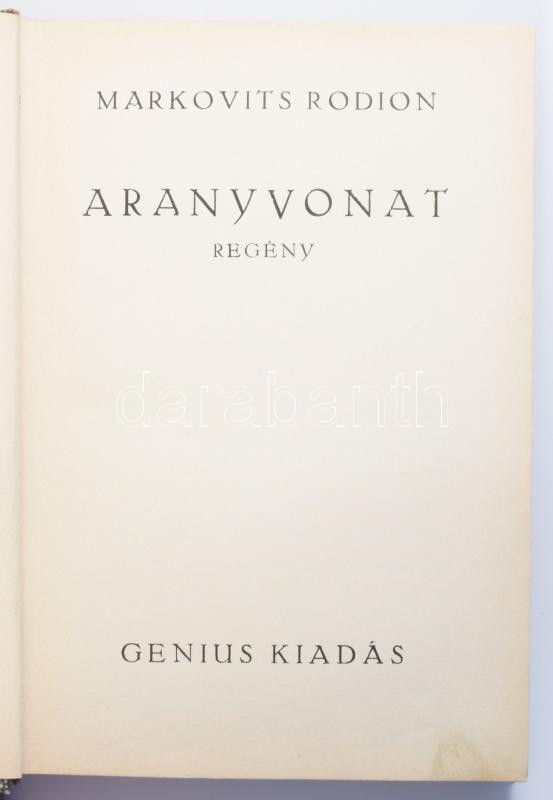 Markovits Rodion: Aranyvonat. Regény. [Bp., 1929], Genius, 353+[1] p. ... https://www.darabanth.com/hu/518-Filatelia-kepeslap-numizmatika-mutargy-konyv-papirregiseg-ekszer-aukcio/524.0/Konyvek/Konyvek-Egyeb-ritkasagok~136/Markovits-Rodion-Aranyvonat-Regeny-Bp-1929-Genius-353plus1-p-Kiadoi-egeszvaszon-kotes~II3516585