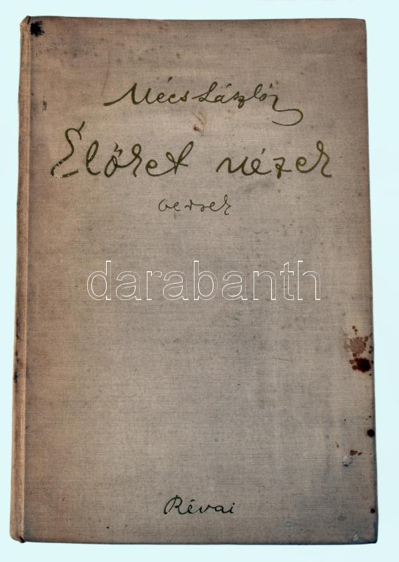Mécs László: Élőket nézek! Versek. Számozott, 1950. számú, kézzel számozott példány. A szerző, Mécs László (1895-1978) költő saját kezű aláírásával, Bajor Ágost ex libris-ével. Bp., [1938], Révai, 142 p. Kiadói aranyozott egészvászon-kötés, kopott, foltos borítóval, kissé sérült, deformált gerinccel.