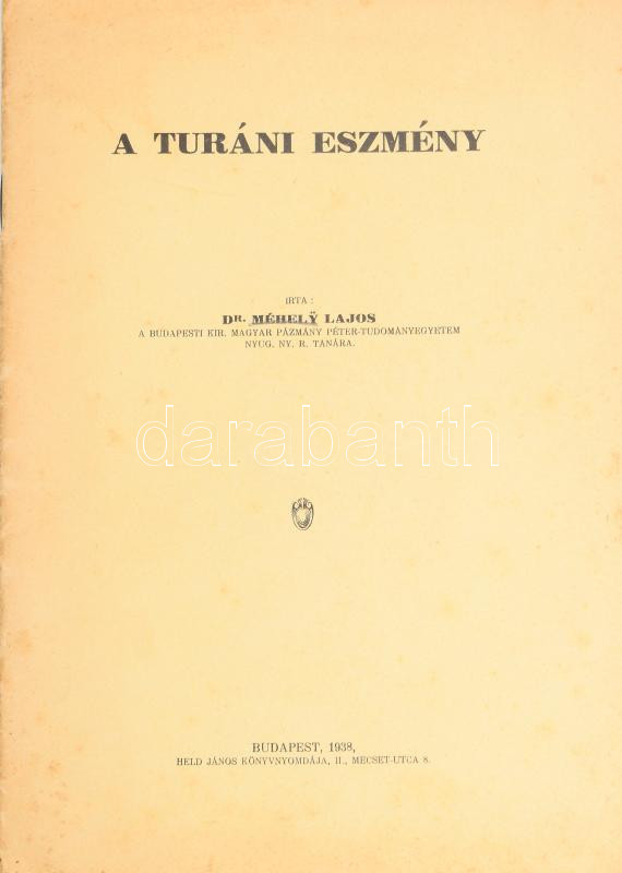 Méhely Lajos: A turáni eszmény. Bp., 1938, Held János, 25+1 p. Kiadói ... https://www.darabanth.com/hu/518-Filatelia-kepeslap-numizmatika-mutargy-konyv-papirregiseg-ekszer-aukcio/524.0/Konyvek/Konyvek-Egyeb-ritkasagok~136/Mehely-Lajos-A-turani-eszmeny-Bp-1938-Held-Janos-25plus1-p-Kiadoi-papirkotes-kisse-foltos~II3514635