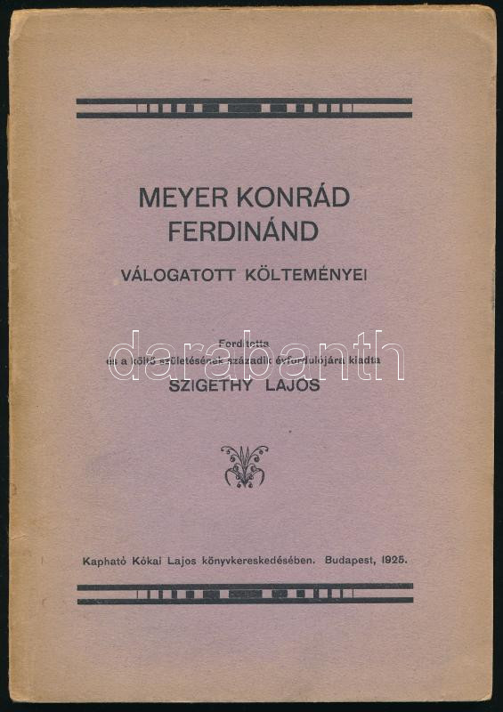 Leírás: Meyer Konrád Ferdinánd válogatott költeményei. Fordította: Szigethy Lajos. Fordító által dedikált! Bp., 1925, Kókai Lajos. Kiadói papírkötés, kopottas állapotban.
