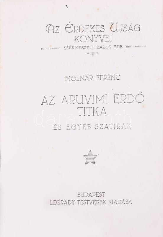 Molnár Ferenc: Az aruvimi erdő titka és egyéb szatírák. Az Érdekes Ujság Könyvei. Bp.,[1916],Légrády, 1 (Molnár Ferenc portréja haditudósítóként) t.+226 p. Első kiadás. Átkötött félvászon-kötés, kopott borítóval, sérült gerinccel, névbejegyzéssel, a hátsó tábla belsején bejegyzésekkel.