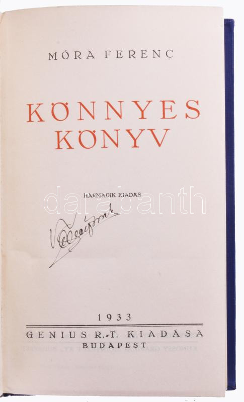 Móra Ferenc: Könnyes könyv. Bp., 1933, Genius. 3. kiadás. Átkötött ara... https://www.darabanth.com/hu/518-Filatelia-kepeslap-numizmatika-mutargy-konyv-papirregiseg-ekszer-aukcio/524.0/Konyvek/Konyvek-Egyeb-ritkasagok~136/Mora-Ferenc-Konnyes-konyv-Bp-1933-Genius-3-kiadas-Atkotott-aranyozott-egeszvaszon-kotes-~II3503167