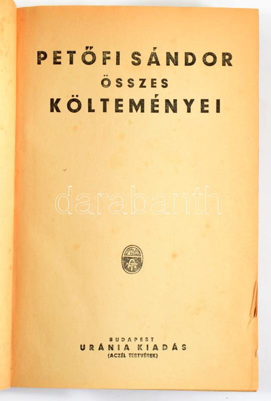 Petőfi Sándor összes költeményei. Bp., Uránia. Kiadói egészvászon köté... https://www.darabanth.com/hu/518-Filatelia-kepeslap-numizmatika-mutargy-konyv-papirregiseg-ekszer-aukcio/524.0/Konyvek/Konyvek-Egyeb-ritkasagok~136/Petofi-Sandor-osszes-koltemenyei-Bp-Urania-Kiadoi-egeszvaszon-kotes-kopottas-allapotban~II3514053