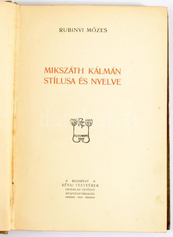 Rubinyi Mózes: Mikszáth Kálmán stílusa és nyelve. Mikszáth Kálmán munk... https://www.darabanth.com/hu/518-Filatelia-kepeslap-numizmatika-mutargy-konyv-papirregiseg-ekszer-aukcio/524.0/Konyvek/Konyvek-Egyeb-ritkasagok~136/Rubinyi-Mozes-Mikszath-Kalman-stilusa-es-nyelve-Mikszath-Kalman-munkai-Bp-1910-Revai-246-p~II3514523