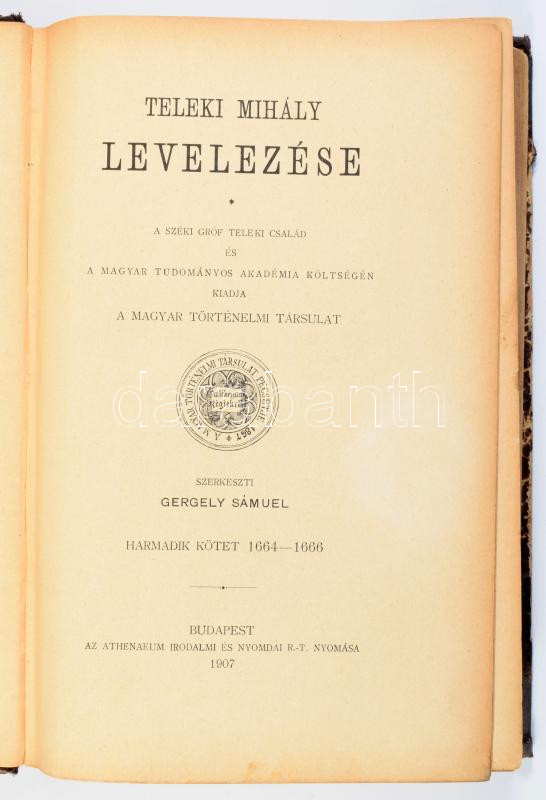 Leírás: Teleki Mihály levelezése. Szerk.: Gergely Sámuel. A római szent birodalmi gróf Széki Teleki család oklevéltára III. köt. (1664-1666). Bp., 1907, Magyar Történelmi társulat, Athenaeum. Átkötött félvászon-kötés, kissé kopott borítóval, néhány kissé foltos lappal.
