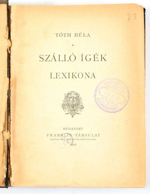 Leírás: Tóth Béla: Szálló igék lexikona. Bp., 1906, Franklin. Félvászon kötés, sérült, címlap kijár, kopottas állapotban.