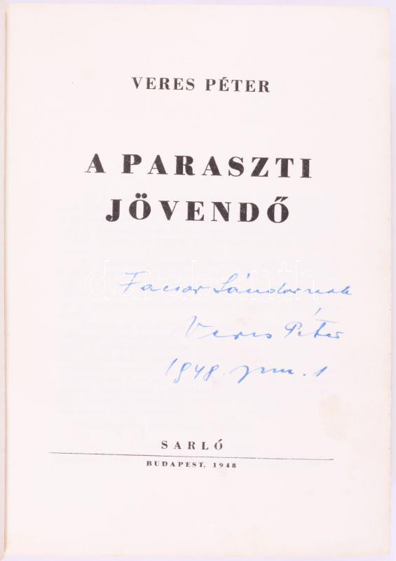 Veres Péter: A paraszti jövendő. A szerző, Veres Péter (1897-1970) író, politikus által DEDIKÁLT példány! Bp., 1948., Sarló, 256 p. 1. kiadás.